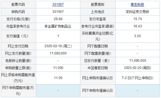 常友科技2025年2月17日披露的首次公开发行股票并在创业板上市发行公告显示,按本次发行价格28.88元/股,公司预计募集资金总额为31,999.04万元,扣除预计发行费用5,732.42万元(不含增值税)后,预计募集资金净额为26,266.62万元。