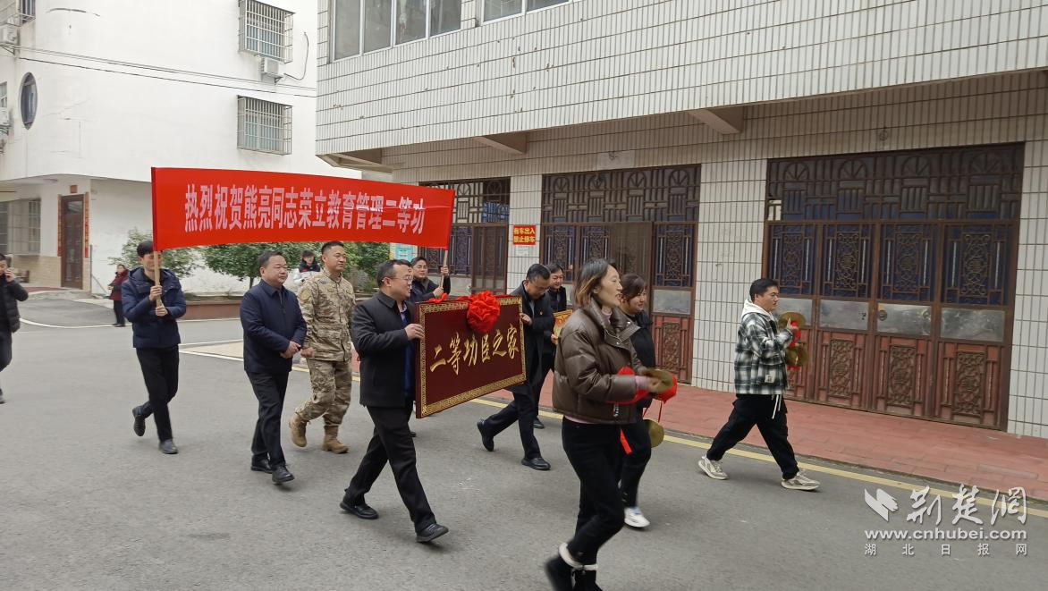 一路上,锣鼓喧天,麻城市武装部政委郭如生带领慰问组将立功喜报、“二等功臣之家”牌匾、慰问金送到熊亮亲属手上,周围邻居闻喜而来,一同参与这喜庆的仪式,现场热闹非凡。