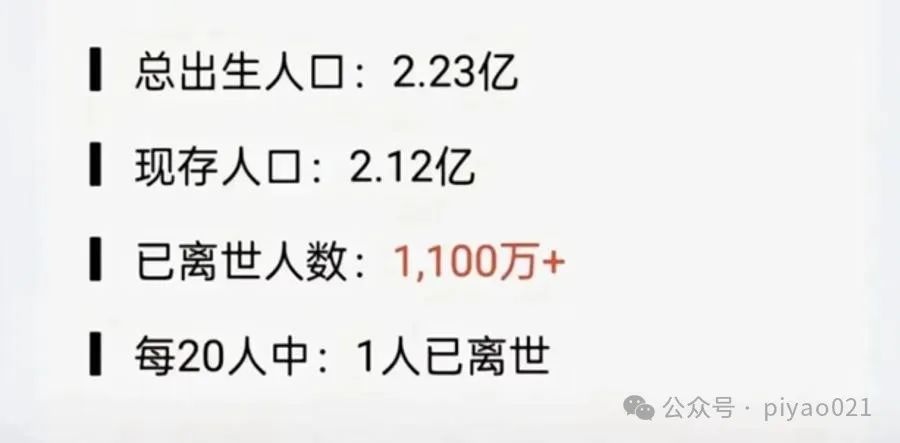 在数字的细节上,也有很多错误。比如广为流传的“80后”现状图片。首先,“80后”总人数,如果以七普数据中的30-39岁的人口数对应,按官方统计,2020年这个年龄段共有223158122人。这与上图中的总出生人口数正好对应,但显然,这不可能是出生数,而是2020年当时依然存活的这个年龄段的人口数。而2.12亿的数据,没有找到任何官方信息来源。死亡人数1100万,我们也未找到相关数据。在七普年鉴中,明确标出是2019年11月1日到2020年10月31日的死亡数据。30-39岁的人口这一年共死亡193517人。