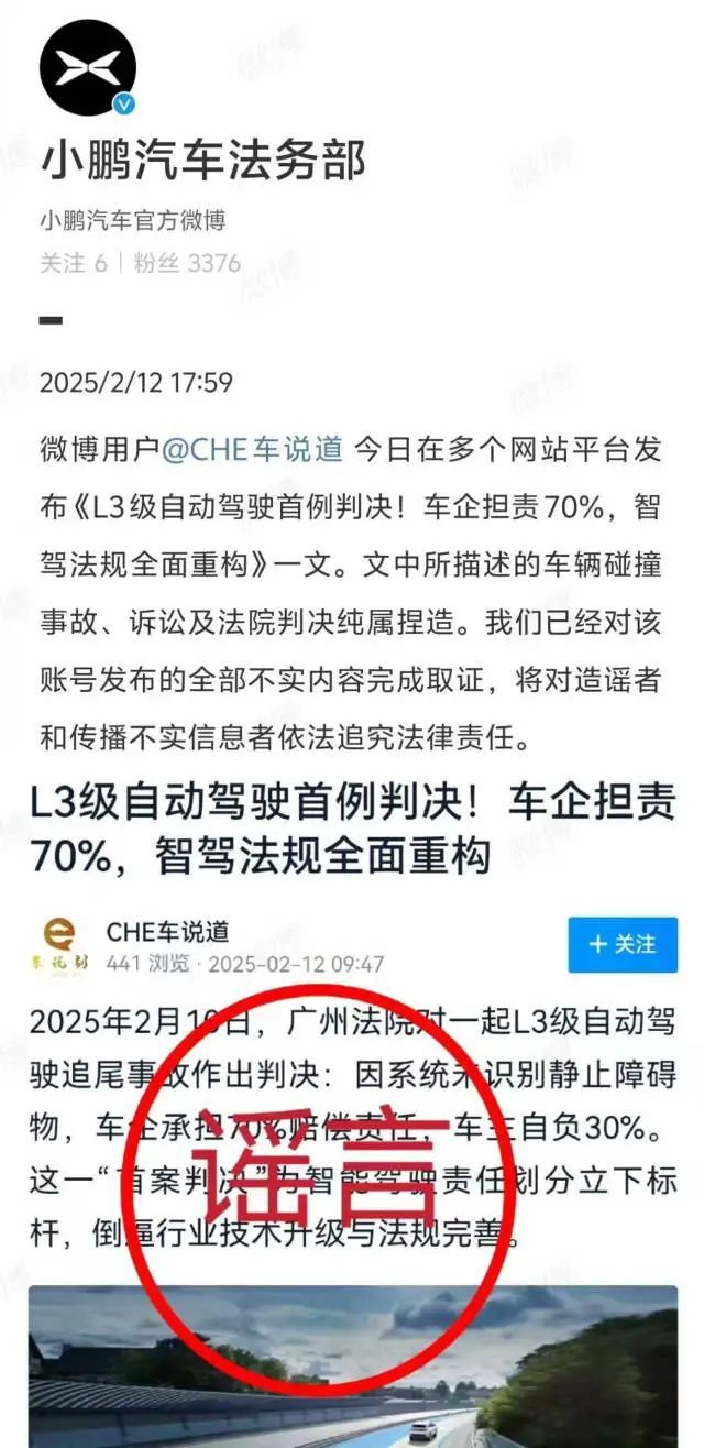 传言所涉车企小鹏汽车法务部当即发文称,文中所描述的车辆碰撞事故、诉讼及法院判决纯属捏造。该司已经对该账号发布的全部不实内容完成取证,将对造谣者和传播不实信息者依法追究法律责任。