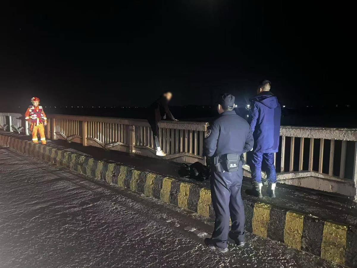 2月15日23时许,湖北襄阳市襄州区双沟镇唐白河大桥上上演了一场惊心动魄的营救行动。一名男子站在桥面护栏外,背靠护栏,疑似准备跳河轻生,请求民警帮助。
