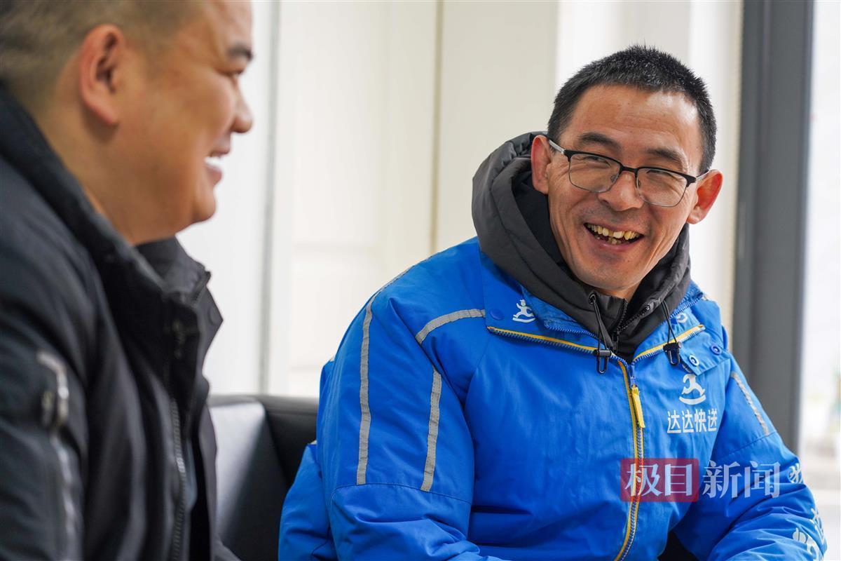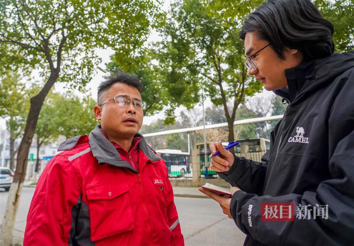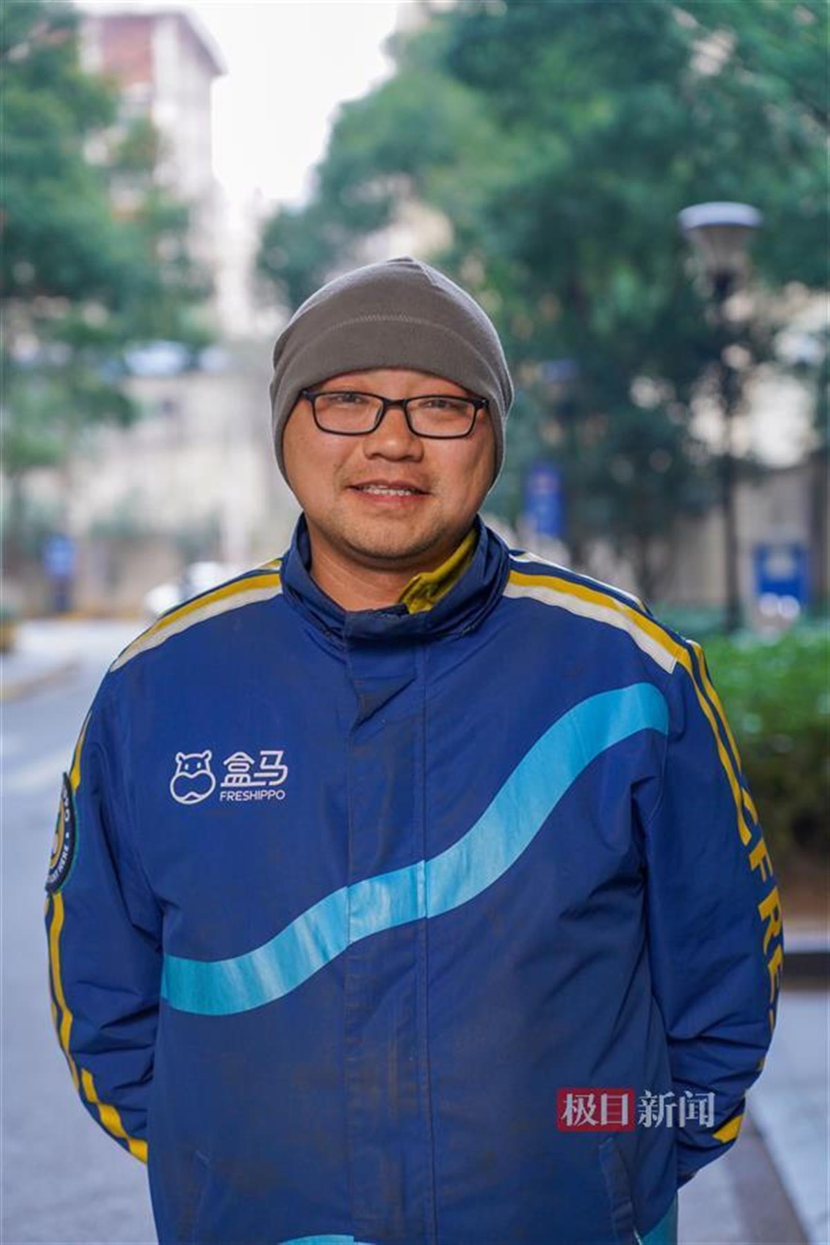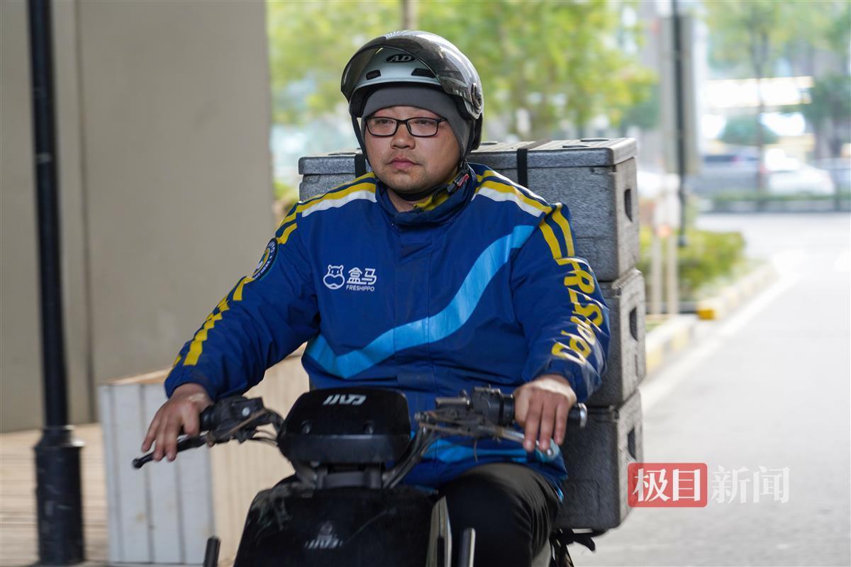 盒马鲜生配送员邹瑞(左)接受极目新闻采访