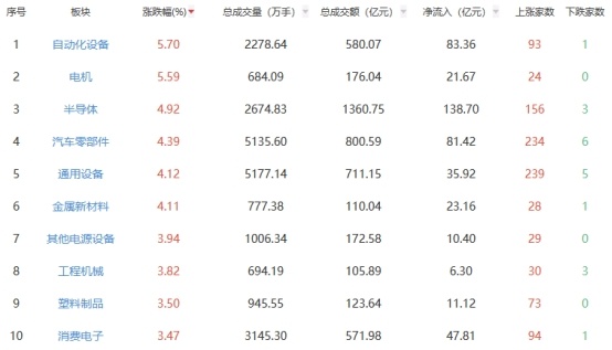 行业板块方面,自动化设备、电机、半导体等板块涨幅居前,银行、煤炭开采加工板块下跌。