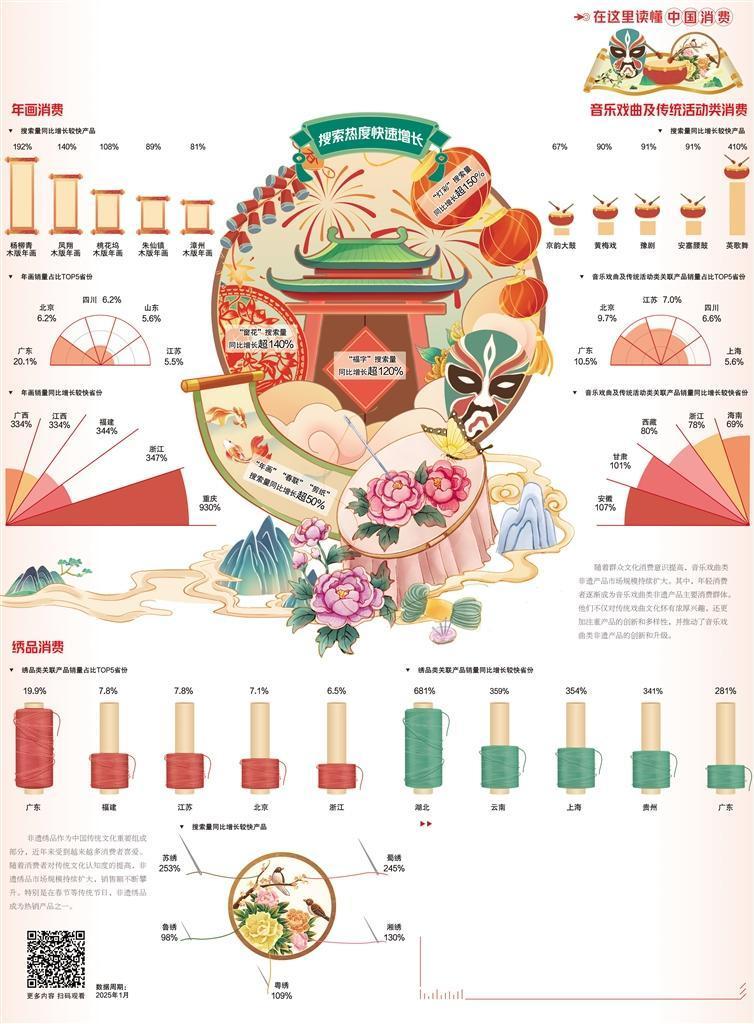 创意十足的木版年画、火遍全网的潮汕英歌舞、古韵十足的刺绣佳品……非遗元素正掀起各地消费新浪潮。当前,我国拥有10万余项各级非遗代表性项目,这些传统瑰宝如繁星般璀璨。但是,如何让这些传统技艺重新焕发生机、吸金吸睛,既是文化命题,也是一道商业考题。