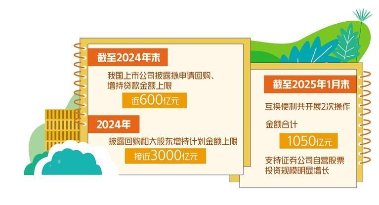目前,两项工具取得初步成效。《报告》数据显示,截至2025年1月末,互换便利共开展2次操作,金额合计1050亿元,支持证券公司自营股票投资规模明显增长。截至2024年末,我国上市公司披露拟申请回购、增持贷款金额上限近600亿元;2024年披露回购和大股东增持计划金额上限接近3000亿元,创历史新高。
