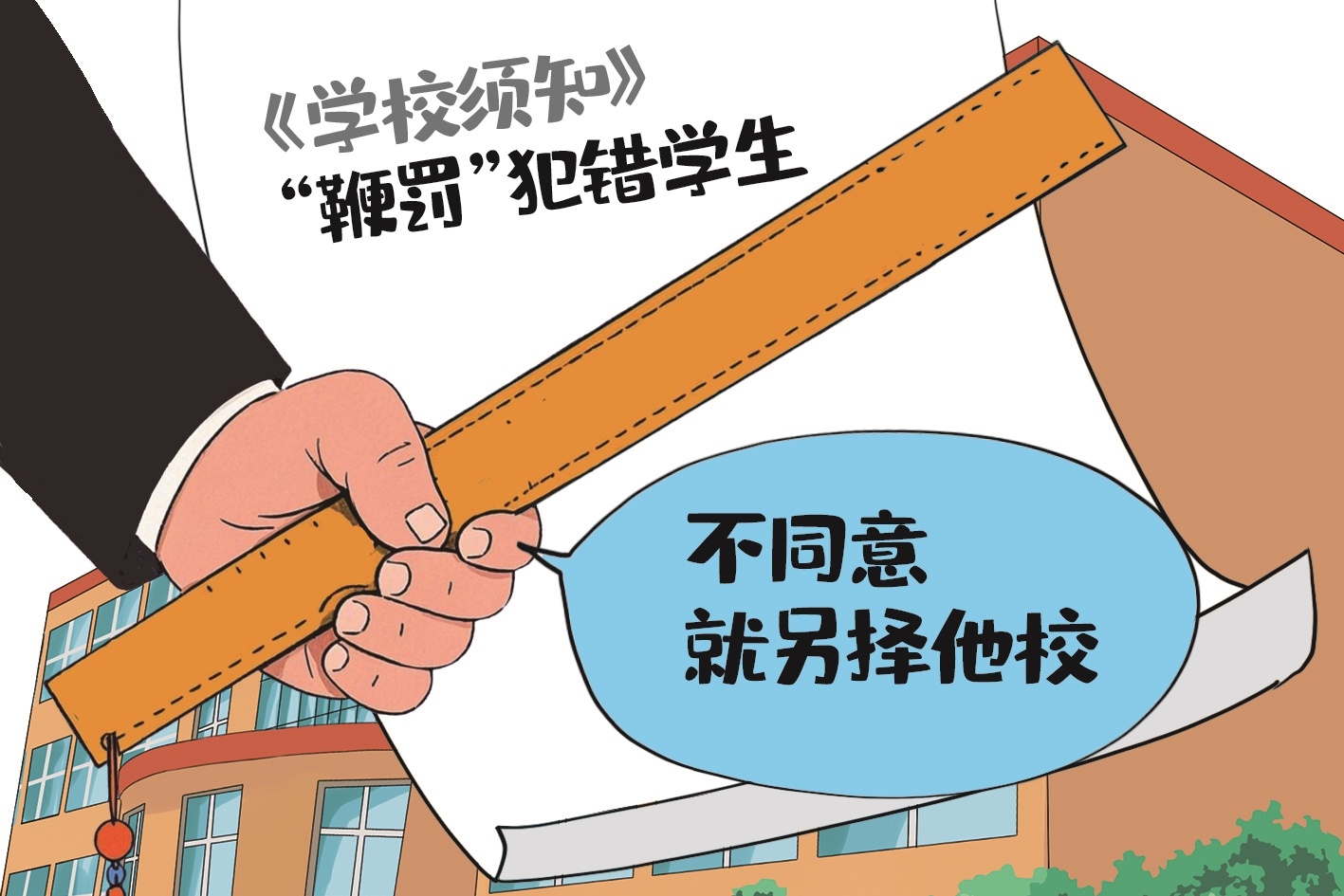 学校声称,对“鞭罚”规定有异议的学生或家长,可向班主任或学校领导说明,实在不能接受的,也可另择他校。这是把体罚条款变成“霸王条款”,逼着学生和家长接受。真不知他们的底气来自哪里。