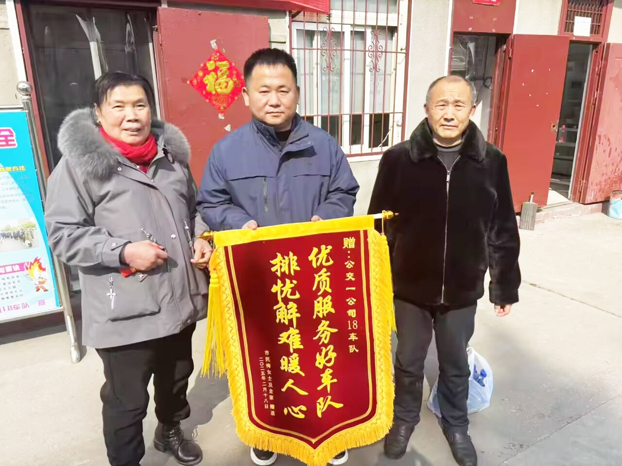 梅女士夫妇(左一、右一)向线路管理人员送上锦旗