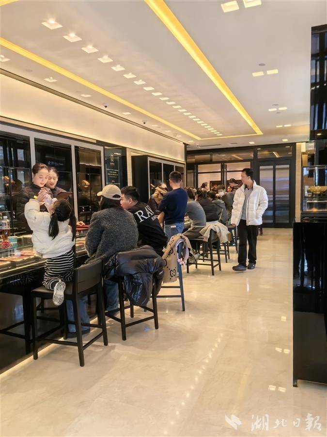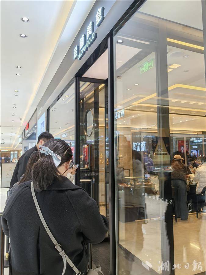 春节期间,为了参与商场积分和门店折扣叠加下来的“88折”活动,甚至有消费者排队约10小时。2月18、19日,湖北日报全媒记者连续探访武商世贸广场老铺黄金店,发现尽管活动已经结束,但顾客依旧不少。武商工作人员透露,活动期间老铺黄金带动整个商场的黄金珠宝品类销售额同比增长35%,该门店单店同比销售增长了5倍。