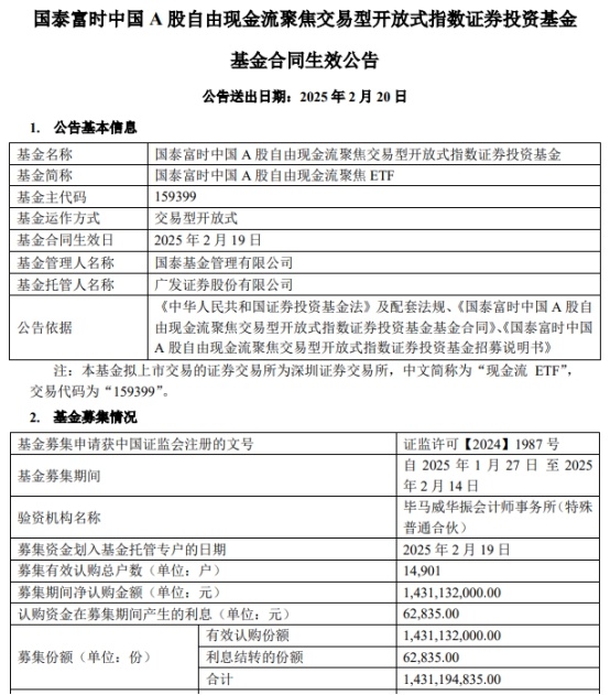 中国经济网北京2月20日讯 今日,国泰基金管理有限公司发布国泰富时中国A股自由现金流聚焦交易型开放式指数证券投资基金基金合同生效公告。