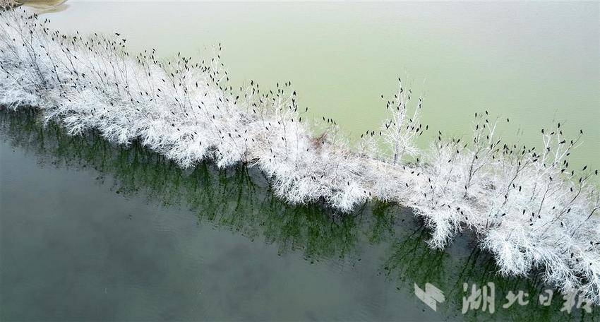 2月19日,武汉鲁湖湖中的一排树木吸引了许多游客的目光。这里的树木被上有成千上万只鸬鹚等水鸟的粪便染白,出现难得一见的“雾凇”景观。近年来,随着鲁湖水生态的向好,在这里停留越冬的鸟类越来越多。因鸟类数量较多,鸟粪把树木染成了白色,从高处看,这条湖中树林仿佛覆盖了一层积雪。(湖北日报全媒记者 朱熙勇 摄)