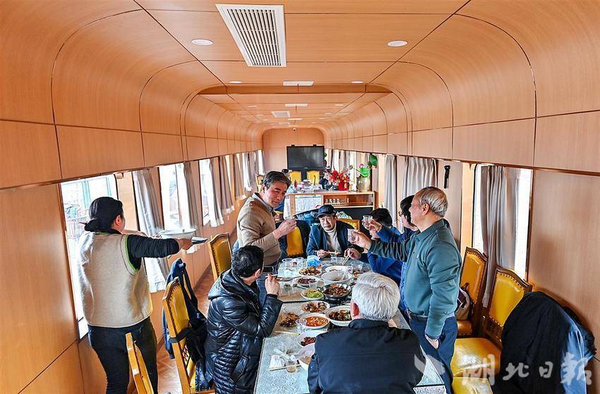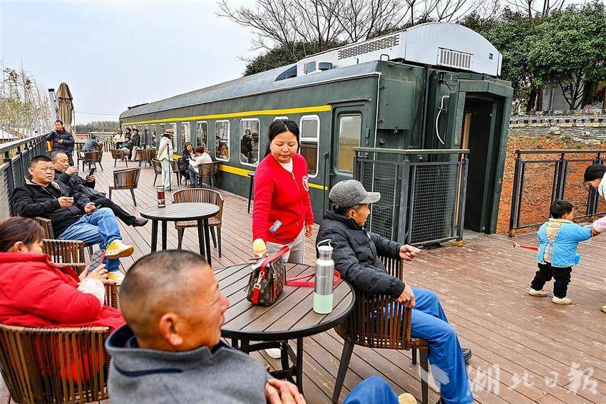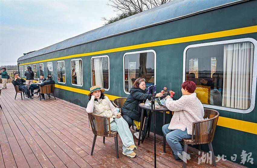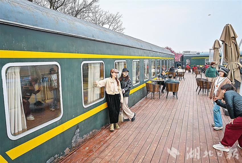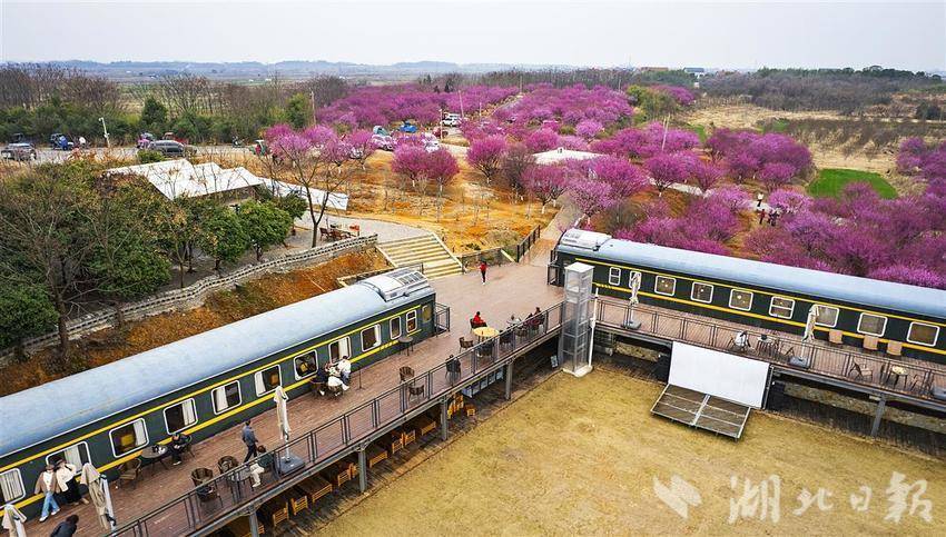 2月19日,武汉江夏区法泗街联盟村一处梅花花海旁,由两节复古火车车厢组成的特色民宿吸引了众多游人前来打卡消费。