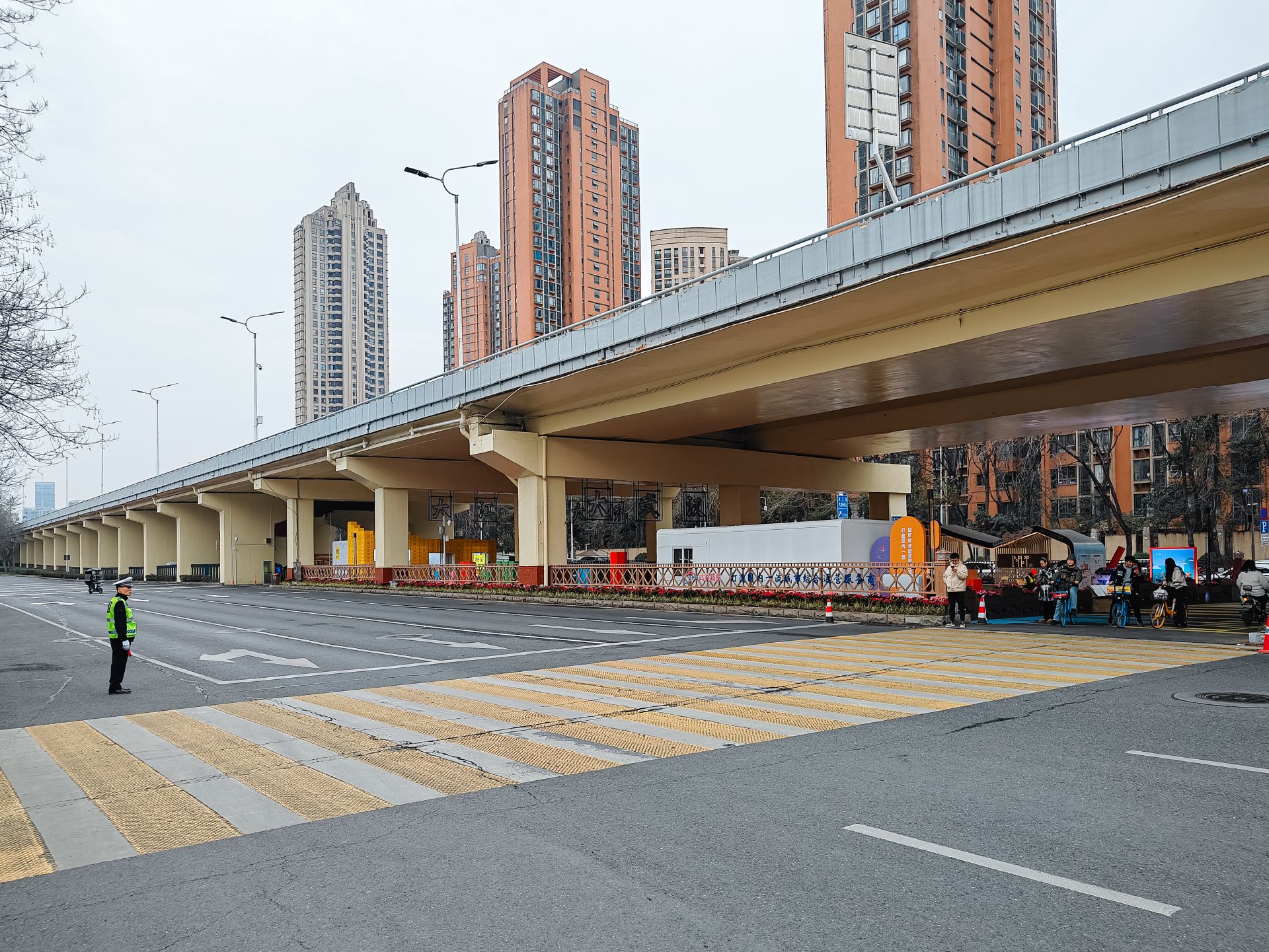 19日下午,记者在黄浦大街长江二桥桥下看到,从沿江大道转盘至解放大道转盘,桥梁底部和立柱告别了此前冰冷的青灰色,披上了明黄色的新装,地面红、黄、绿相间的防滑透水步道,穿插热干面波形图案、竞速赛道等元素,显得热烈活泼。桥下,一间方形小屋挂牌“便民护学岗”,内有交管监控和医疗急救设备,门前则是交通安全宣传墙、展示台。不远处的轨道交通1号线下,由武汉地标元素组成的打卡点,吸引了不少市民、游客拍摄轻轨列车穿行而过的独特风景。