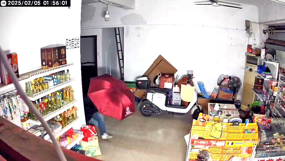 便利店的监控视频显示,当日凌晨1时55分,一名男子打着一把大红色雨伞,弯着腰,蹑手蹑脚进入店内。男子的膝盖以上全部被雨伞遮挡,从膝盖以下露出的部分可见,该男子穿着蓝色牛仔裤、白色运动鞋。