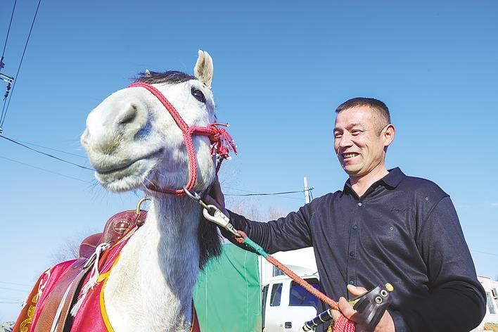 交接时,依立拜接过马鞭,仔细打量着眼前这匹身披大红马衣的白色骏马,右手轻轻摸了摸马头,又捋了捋马鬃。“‘赛里木湖’马与‘白龙’马长得太像了。”这位39岁的哈萨克族汉子几度哽咽。随即,他纵身跃上马背,脸上绽放出灿烂的笑容。