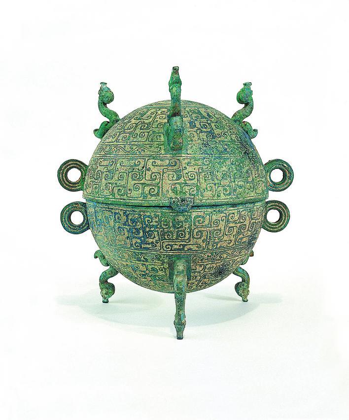 大鼎整体呈现出的浑圆造型,和古代名叫“敦”的青铜器如出一辙。敦曾是供古代贵族享用的盛食器,用于盛放五谷。湖北省博物馆收藏的嵌地几何云纹铜敦、随州市博物馆收藏的菱形勾连云纹敦,都是其中的精品。