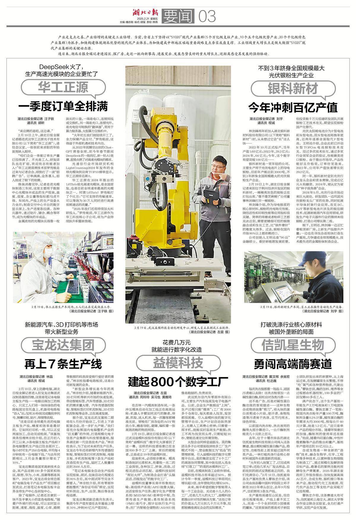 “大年初八就复工了,已完成两笔订单;还给几家大厂发去样品,目前收到的测试反馈都是正向的。我们充满信心。”2月18日,佶凯星房县生产基地负责人曹铁忠介绍,该公司由房县籍中国科学院院士邓子新在2022年牵头创立,去年9月投产,目前拥有3条生产线。