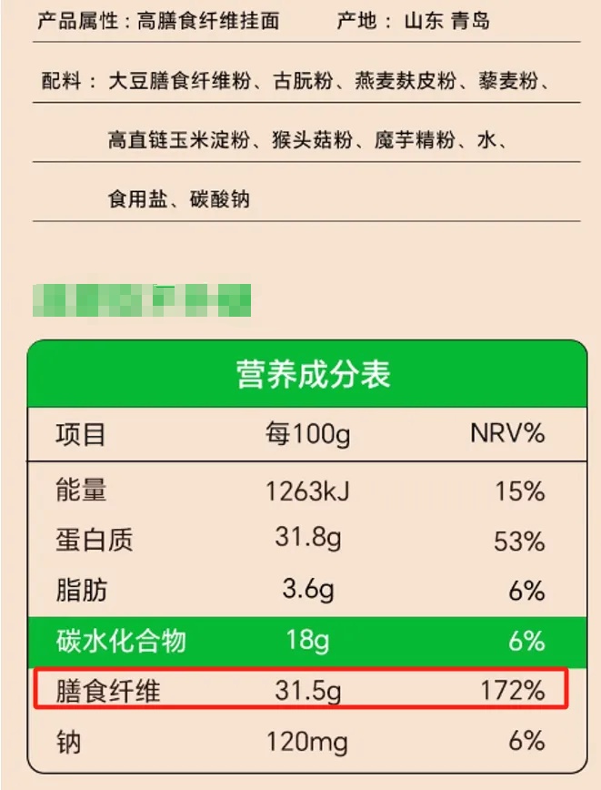 △某品牌菠菜挂面,膳食纤维和铁含量还不错