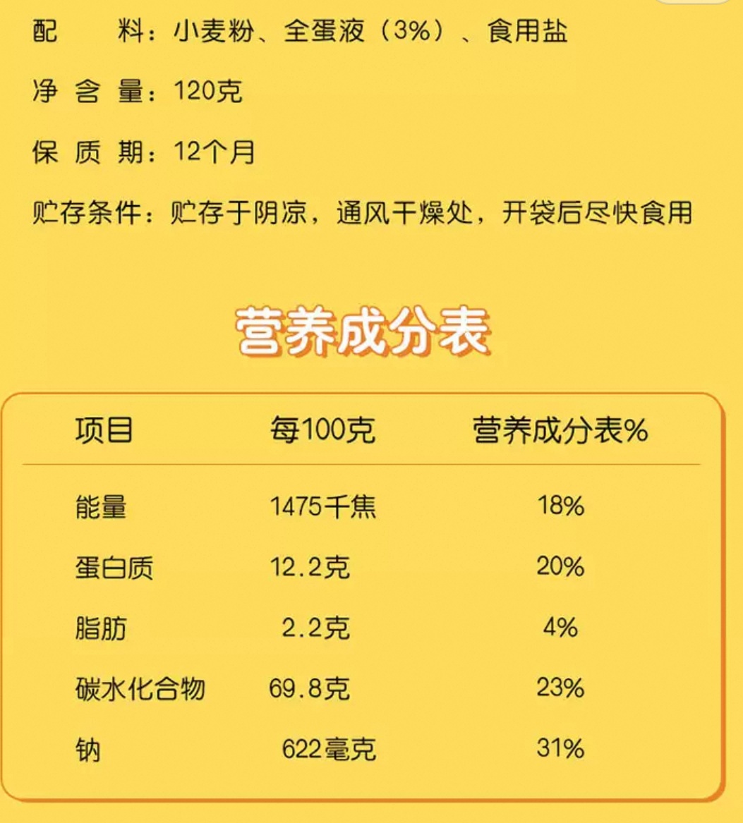 比如下图这款加了3%全蛋液的鸡蛋面,蛋白质含量比普通挂面要略高一些,口感也更筋道。