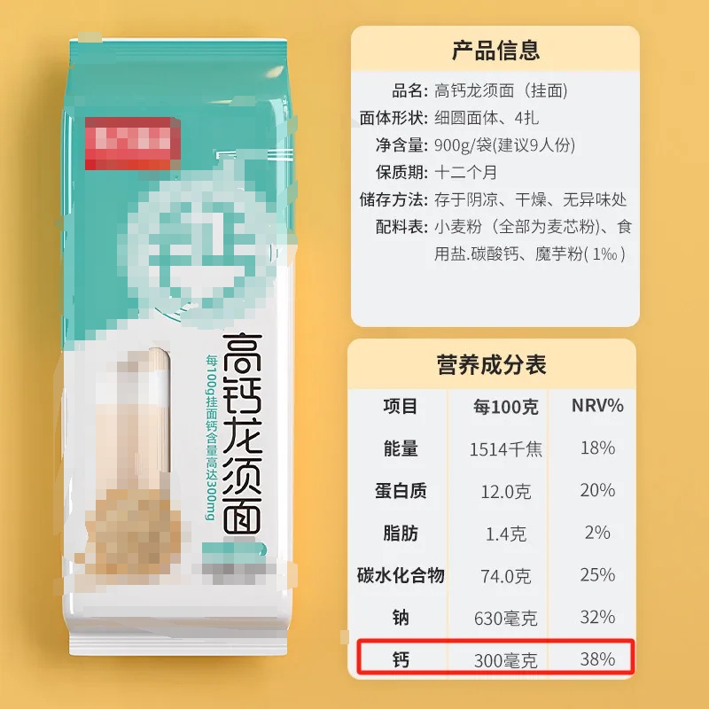 比如下图这款强化了钙的挂面,吃100克挂面就能增加300毫克的钙摄入,可满足每日一般人群钙需求量的近38%,还是挺不错的。