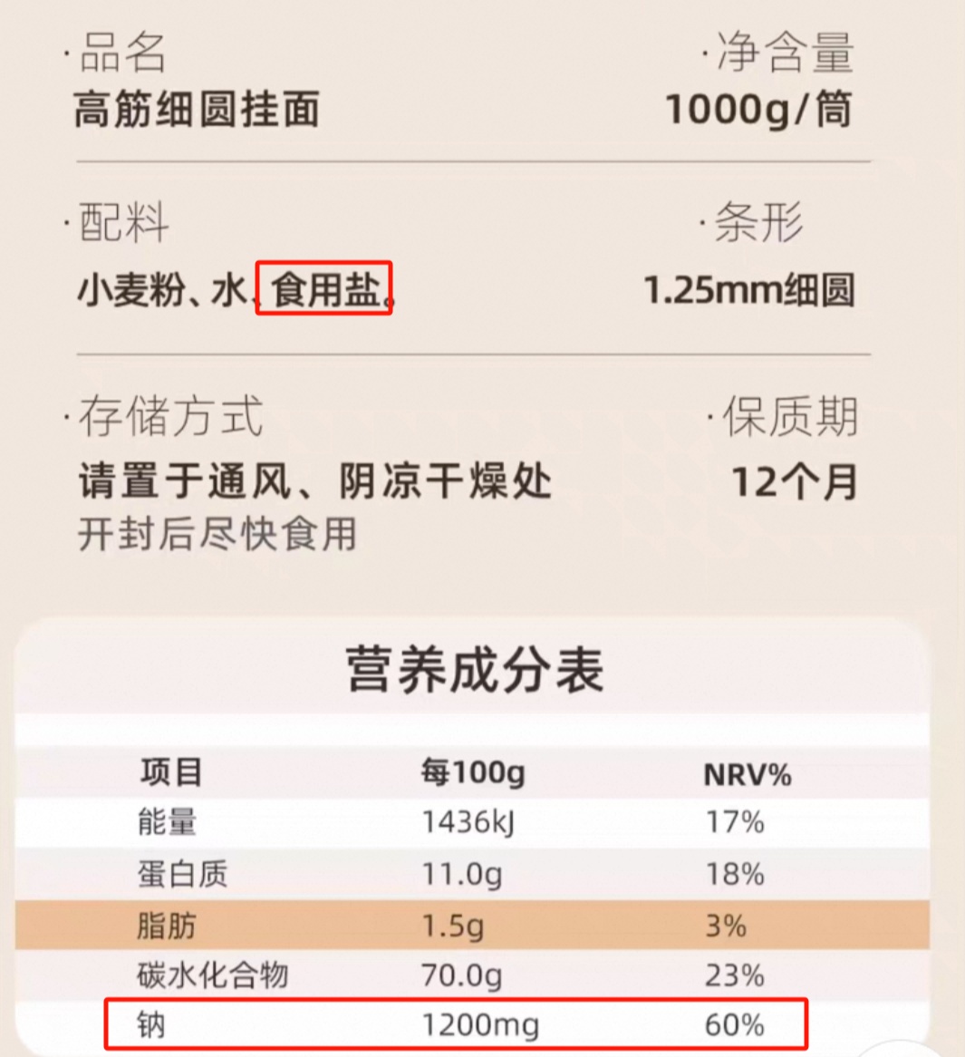 比如下图这款,钠含量高达1200毫克/100克,这就意味着吃100克挂面,将会摄入近3克盐,已经占到了每日盐摄入量的60%。很多人吃面还得配上偏咸一些的卤子,这一餐的盐摄入量就更高了,以至于全天的盐量较难控制在《中国居民膳食指南》推荐的5克之内。常吃这样的挂面,对心血管的健康不利。