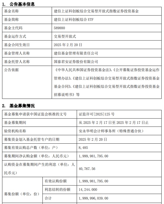 中国经济网北京2月21日讯 今日,建信基金管理有限责任公司发布建信上证科创板综合交易型开放式指数证券投资基金基金合同生效公告。