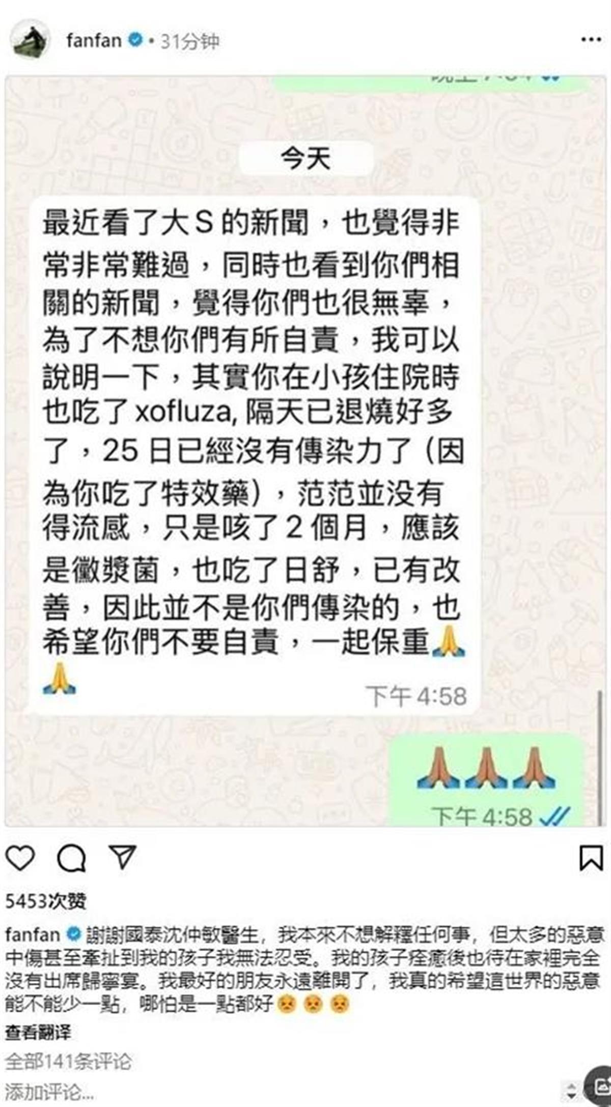 2月初,徐熙媛(大S)因流感并发肺炎去世。有网友留言称范玮琪和陈建州患流感还参加聚会,可能将病毒传染给大S。