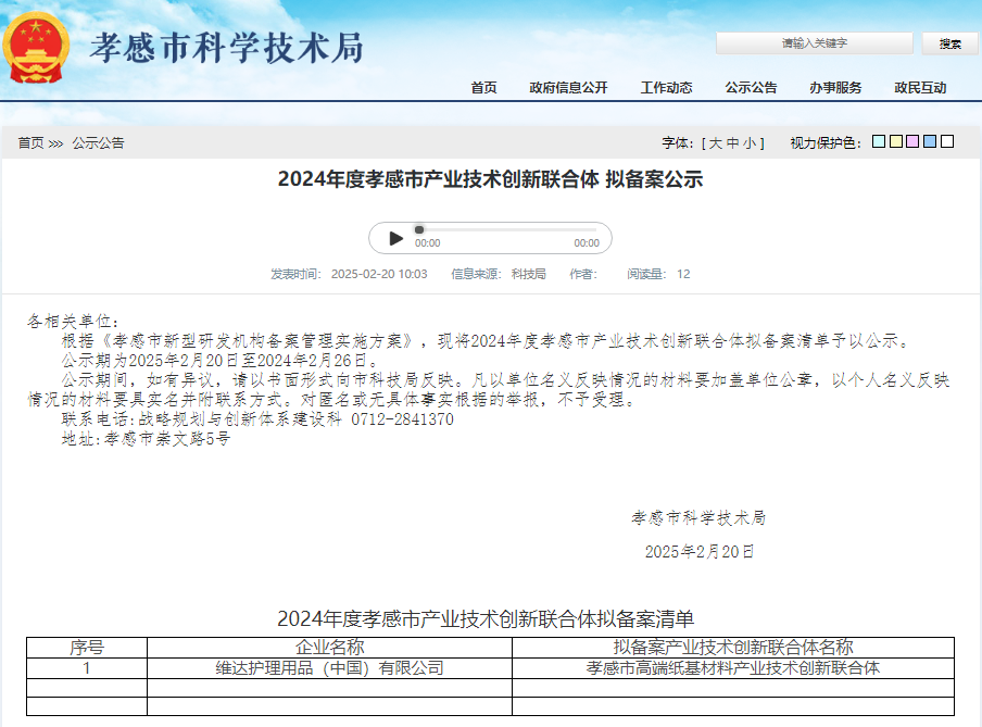 荆楚网(湖北日报网)讯(通讯员 李国臻)2月20日,孝感市科技局发布2024年度孝感市产业技术创新联合体拟备案公示。其中,维达护理用品(中国)有限公司联合中国制浆造纸研究院、湖北工程学院、武汉轻工大学等单位申报的高端纸基材料产业技术创新联合体唯一入选公示名单。