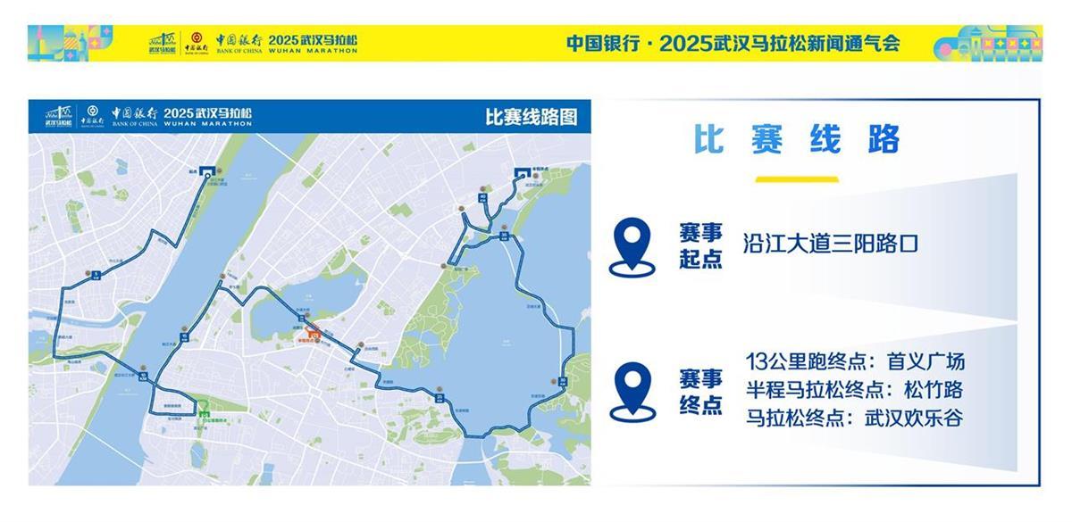 13公里跑终点位于首义广场,半程马拉松终点位于松竹路,全程马拉松终点位于武汉欢乐谷。