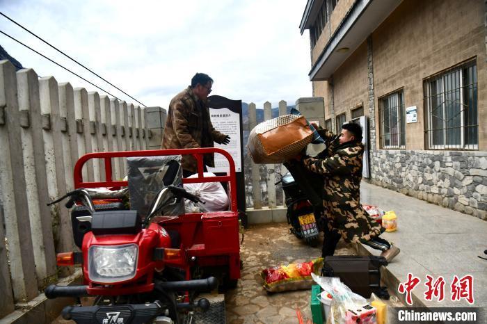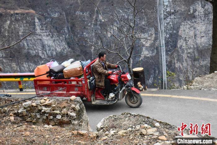 图为古路村村民用三轮车将生活物资运到家里,随着索道的运行,村里道路也进行了修整。中新社记者 张浪 摄