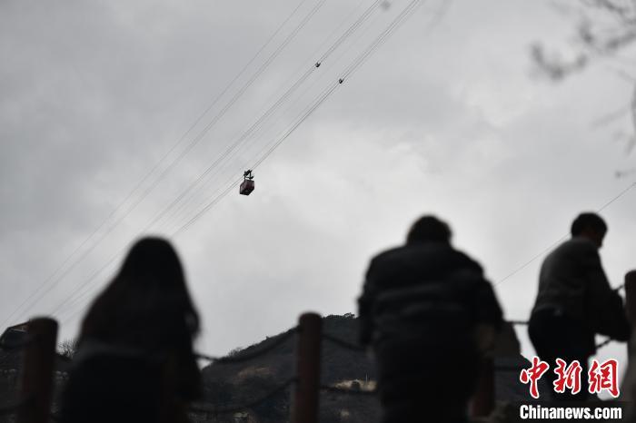 2月21日,位于四川省雅安汉源县永利彝族乡古路村的骡马道吸引不少徒步游客。这条凿建在悬崖峭壁间、长8公里、不到1米宽的骡马道于20多年前建成,曾是村民进出山的唯一通道,伴随着高空索道的开通,村民从3小时的进出村时间缩短至5分钟,而昔日的骡马道如今成为游客的观光路。图为高空索道从行走在骡马道上的游客上空划过。中新社记者 张浪 摄