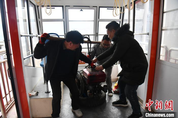 图为古路村村民协力将柴油机从索道轿厢搬运到村里。中新社记者 张浪 摄