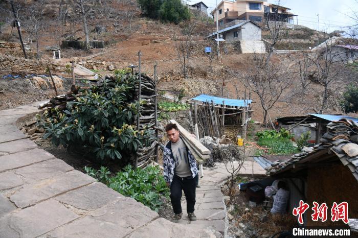 图为古路村村民在搬运建材,这些材料通过索道运抵村内。中新社记者 张浪 摄