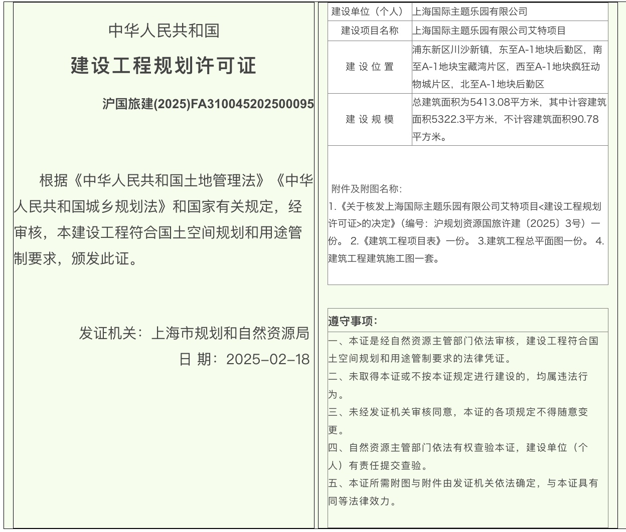 中新网2月21日电(记者 吴家驹)上海市规划和自然资源局网站显示,近日,上海国际主题乐园有限公司艾特项目取得建设工程规划许可证。许可证显示,该项目建设位置位于浦东新区川沙新镇,东至A-1地块后勤区,南至A-1地块宝藏湾片区,西至A-1地块疯狂动物城片区,北至A-1地块后勤区,总建筑面积为5413.08平方米。