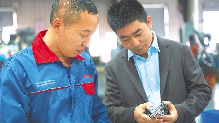 殷利丰(右)检查锁具加工质量。 (湖北日报全媒记者 鲁腾 摄)