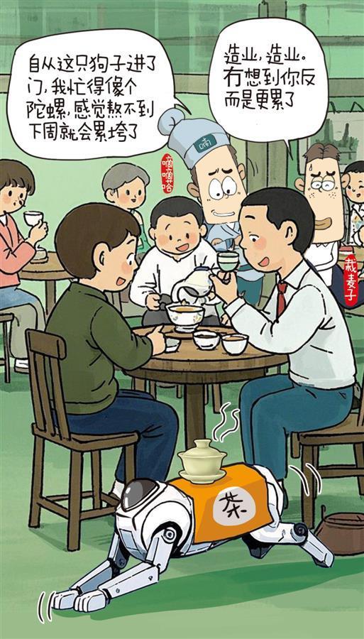嘀嘀嗒:话是这么讲,它克上茶,我只管泡茶。但是你看,它再么样也就是一只狗子唦,还是个机器的,速度是固定的、程序是固定的。这么多人,都等到它来上茶?那冇得几久,屋里就会到处都是等得发烦的人了。说是今天由它来给大家上茶,实际的情况是,我要一边泡茶,还得一边不停地观察,看哪里的人等得最急,就赶紧克帮它补位。每个人都说狗子在帮我的忙,我就蛮想问,它到底是帮了我么事忙?它越帮,我越忙!