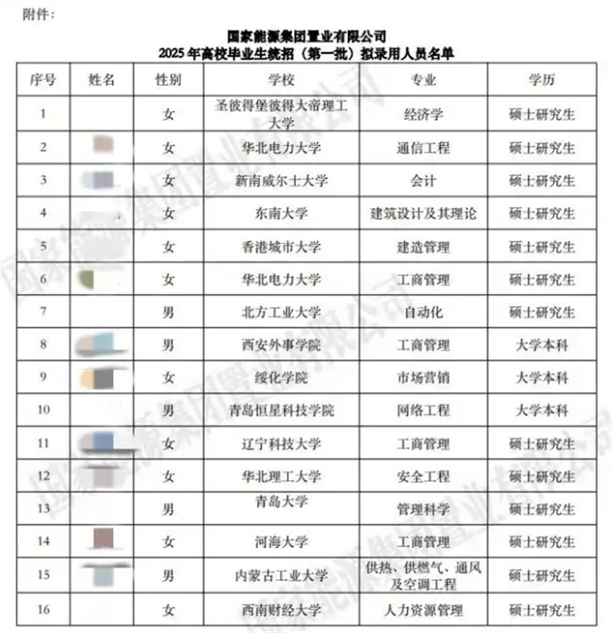 据此前截图显示,已被删除的国能置业拟招录名单中,有13名硕士研究生和3名本科生成为拟录用人员,其中13名硕士研究生分别来自华北电力大学、西南财经大学、圣彼得堡彼得大帝理工大学等国内外知名院校,而3名本科生毕业院校较普通,分别来自绥化学院、西安外事学院、青岛恒星科技学院。