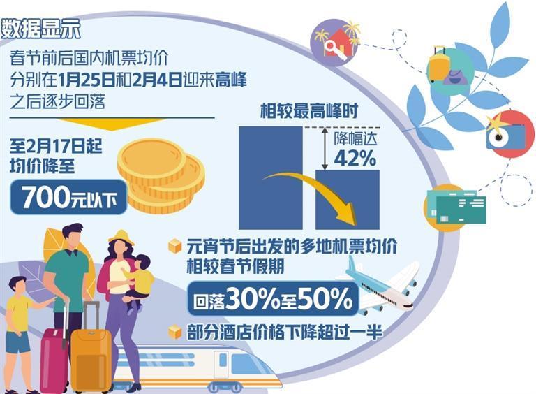 同程旅行平台数据显示,春节前后国内机票均价分别在1月25日和2月4日迎来高峰,之后逐步回落,至2月17日起均价降至700元以下,相较最高峰时降幅达42%。携程平台数据也显示,多地出现低至200元的特价机票,元宵节后出发的多地机票均价相较春节假期回落30%至50%。