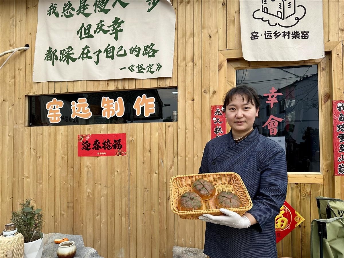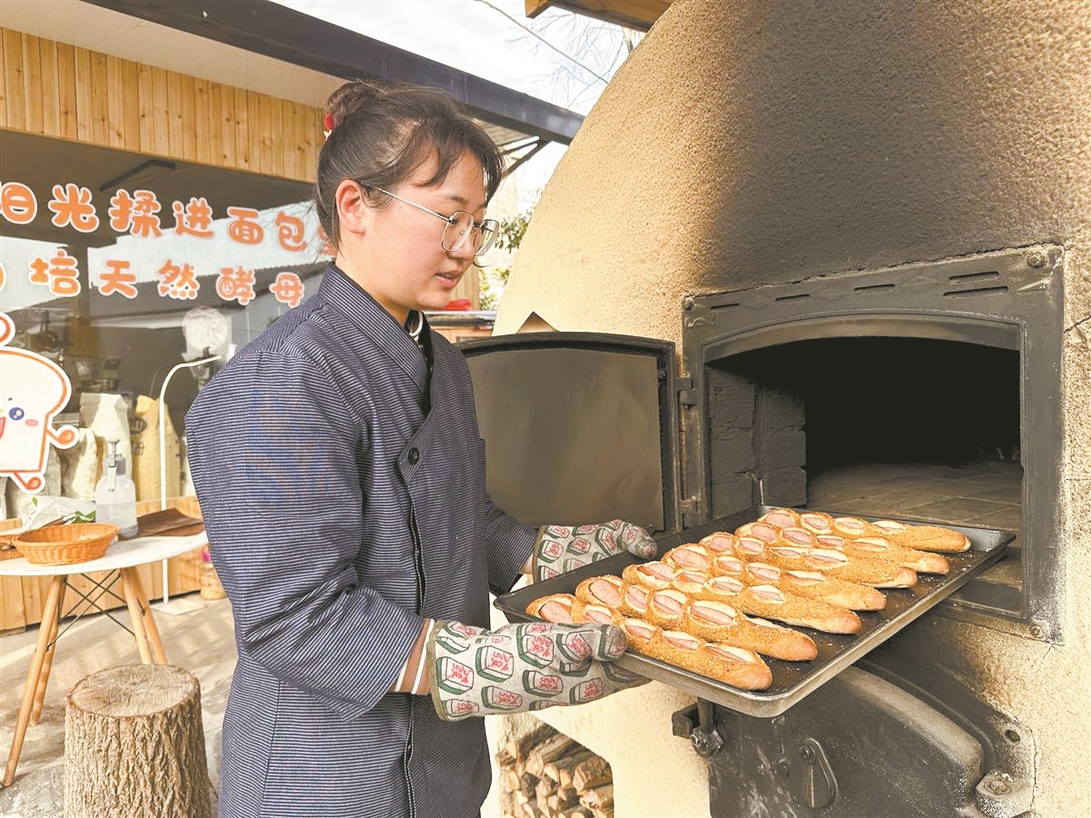 “我们的面包主打纯天然,不含任何添加剂,用柴火窑烘烤出来,还带有一种独特的烟熏感,很受市民欢迎。”葛悦琪端出的一大盘面包,外酥里柔,香气扑鼻,瞬间被游客“抢光”。