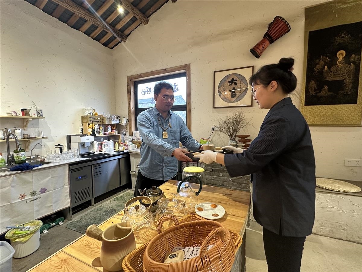 吹着春风,晒着太阳,喝着咖啡,尝一口新鲜出炉的窑烤面包,一扫疲惫的身心。在葛悦琪的诗意小院,58岁的刘兰带着退休的姐妹,特意来到面包房打卡。“乡村空气清新,到这样别致的小院里坐一坐,顿时感觉神清气爽。”
