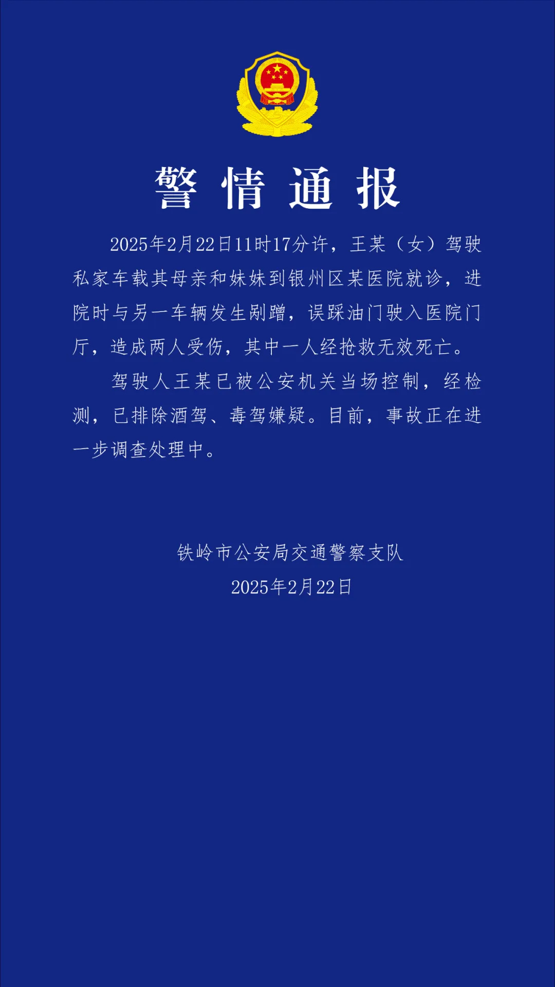 中新网2月23日电 据“铁岭交警”微信公众号消息,辽宁省铁岭市公安局交通警察支队发布通报称,2025年2月22日11时17分许,王某(女)驾驶私家车载其母亲和妹妹到银州区某医院就诊,进院时与另一车辆发生剐蹭,误踩油门驶入医院门厅,造成两人受伤,其中一人经抢救无效死亡。