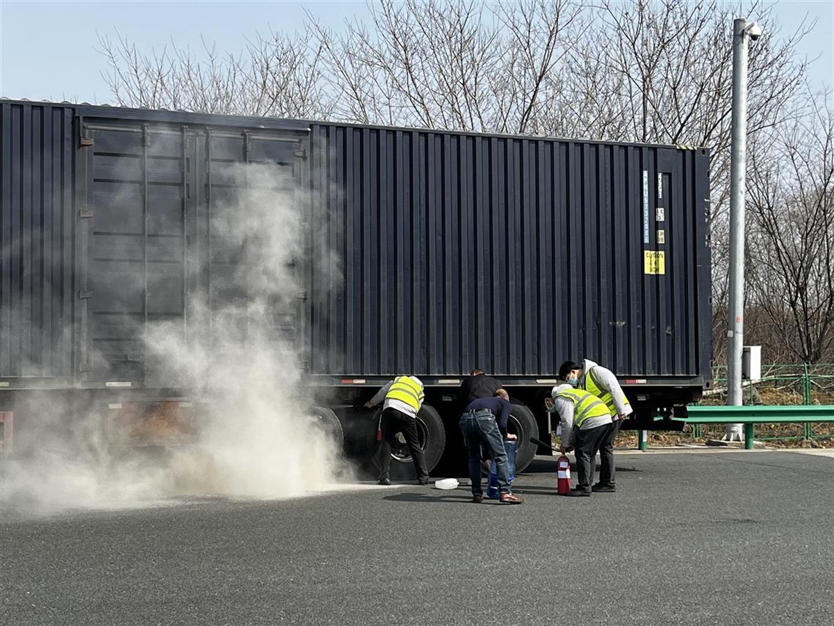 面对突发险情,高速当班班长一边在车辆后方布置安全警示锥,避免发生交通事故,一边组织当班人员拿起灭火器,协助司机全力灭火。