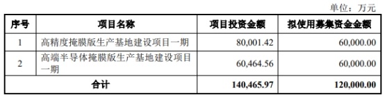 本次向特定对象发行股票募集资金总额不超过120,000.00万元(含本数),募集资金扣除相关发行费用后将用于投资高精度掩膜版生产基地建设项目一期、高端半导体掩膜版生产基地建设项目一期。