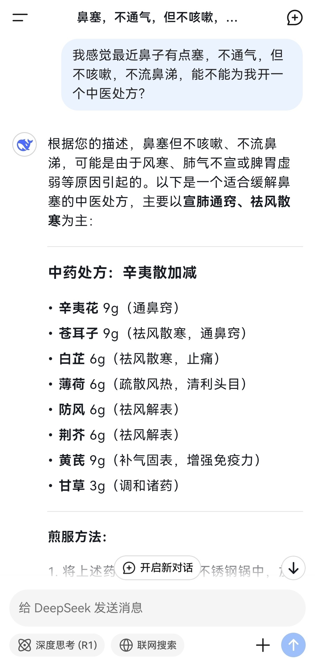 2月21日,极目新闻记者在DeepSeek上进行了问诊,提出“鼻塞、不通气,但不咳嗽、不流鼻涕”的症状,要求开具中医处方。DeepSeek给出了导致该症状的三种可能性:鼻炎、外感风寒或肺脾气虚,并对此生成了处方建议、煎服方法和注意事项。