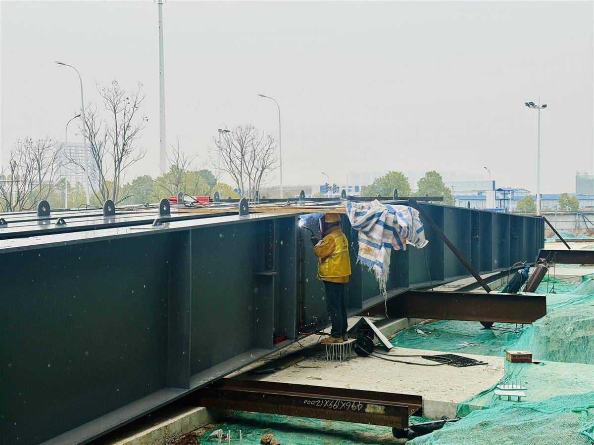 电焊工郝师傅手持焊枪,忙着将3组12米长的钢构件焊接成一根36米长的横梁。一旁的空地上,近10根已经焊接完毕的横梁正待吊装。它们将构成通用厂房A的超长跨度钢结构屋面,这种设计可以为厂房最大限度“让”出内部空间。