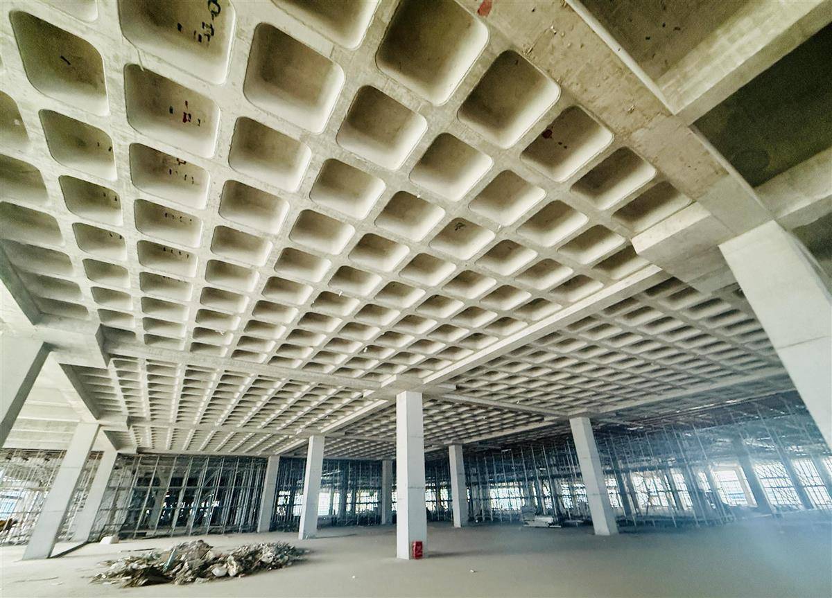 “单层面积超过1万平方米的建筑,支撑立柱的数量通常在120根左右,但通用厂房B的支撑立柱只有81根,数量降低约三成。”孙维介绍,通用厂房B二楼楼板呈蜂窝状,专业说法叫密肋结构。与传统梁式楼板相比,密肋式楼板结构更稳定、承载力更强,可显著减少支撑立柱数量。孙维说,创新技术的应用带动了建设效率提升,立柱减少使得厂房内部空间更大,方便布设生产设备。