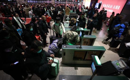 春运首日,乘坐K4159次列车的旅客准备检票乘车。人民网记者 乔雪峰摄