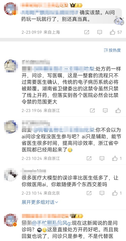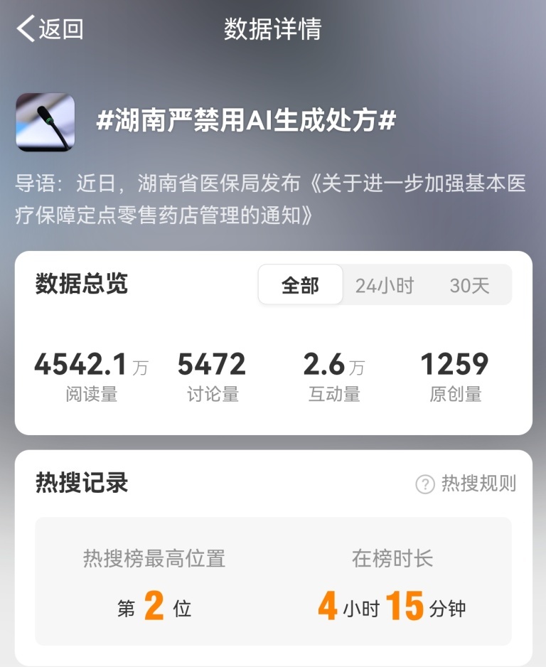 近日,湖南省医疗保障局发布《关于进一步加强基本医疗保障定点零售药店管理的通知》,明确处方要求,严禁使用人工智能等自动生成处方。一时间,#湖南严禁用AI生成处方#话题冲上热搜,阅读量逾4500万。
