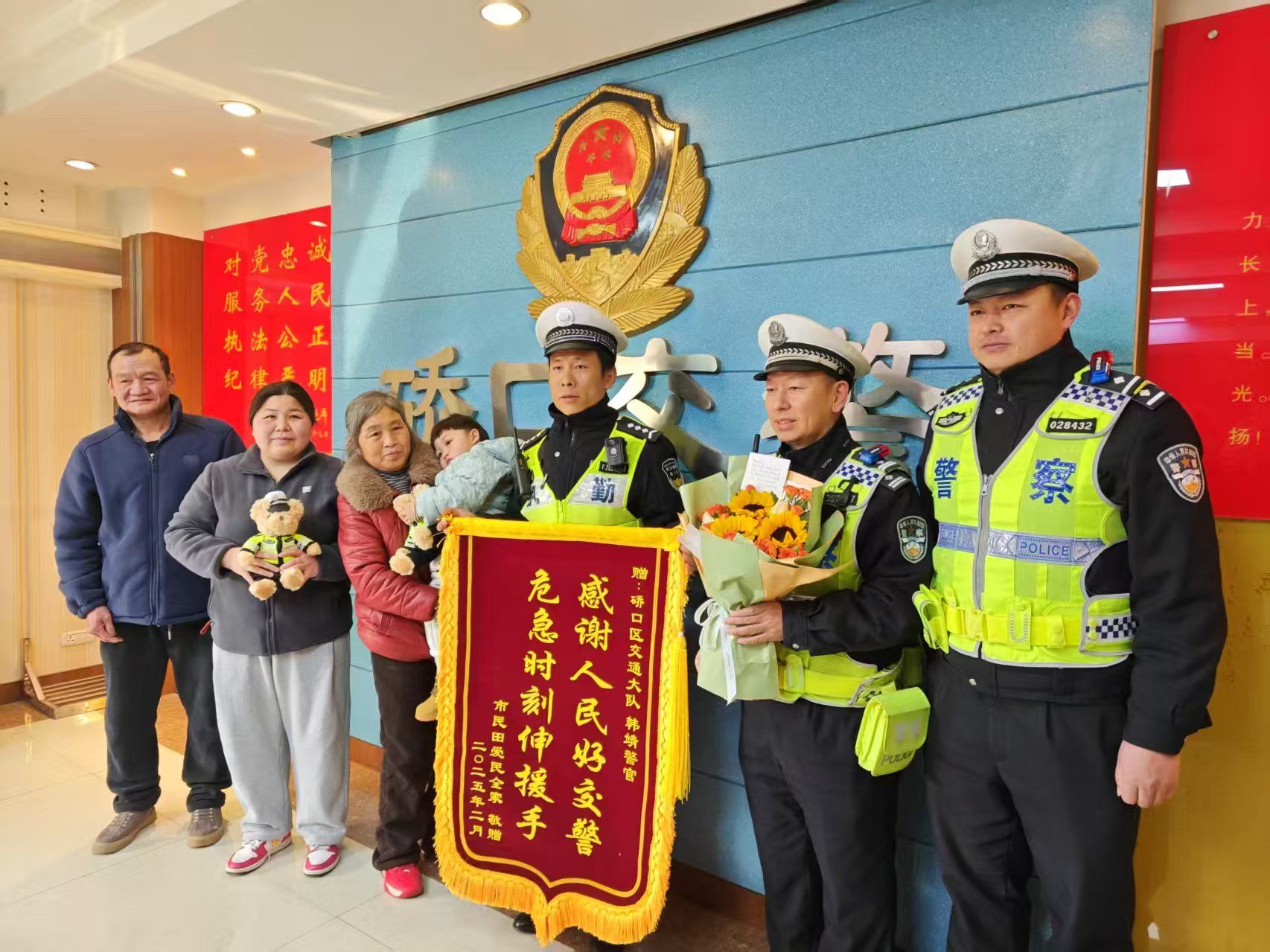 荆楚网(湖北日报网)讯(记者 白云 通讯员 崔钧洋 杜泽文)“谢谢叔叔。”2月24日9时30分许,市民黄女士和公公、婆婆带着已经康复出院的孩子凡凡来到武汉市硚口区交通大队,感谢救他们于危急的辅警韩靖。韩靖特地准备了警察小熊送给凡凡。凡凡接过小熊开心极了,在韩靖脸上连亲几口。