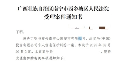 他提供的立案通知书显示,2月20日,原告丁明与被告南宁山姆超市有限公司、沃尔玛(中国) 投资有限公司个人信息保护纠纷一案已在广西壮族自治区南宁市西乡塘区人民法院立案。