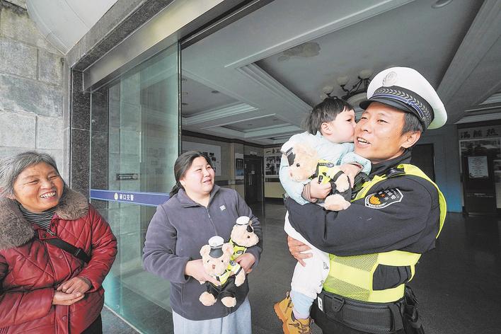 “感谢人民好交警,危急时刻伸援手”,2月24日上午,武汉市公安局硚口区交通大队,黄女士一家将一面锦旗交到辅警韩靖手中,感谢他对孩子的救命之恩。病愈的“小小田”也和家人一起来了,韩靖特地准备了交警小熊玩偶送给他。“小小田”开心极了,在韩靖脸上连亲了几口。2月13日傍晚,黄女士一家在送孩子就医途中遭遇堵车,多亏韩靖抱着昏迷男童狂奔500米,及时送到医院。楚天都市报极目新闻记者邹斌 叶文波摄影报道
